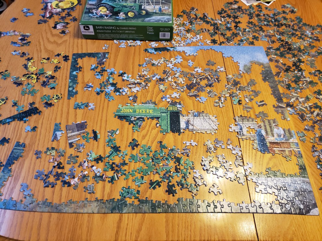 I found the perfect puzzle to put together. It was a puzzle that I found for my Grandma this past winter. Now, you have to understand that we are a John Deere family. (For those of you not from farm country, John Deere is a brand of machinery) You are either a red family or a green family, and we have bled John Deere green for decades. So, when I saw this John Deere puzzle at the store I immediately thought it would be perfect to put together with my Grandma. The puzzle shows a beautiful scene of days gone by where men are building a barn and the kids are having a picnic on a summer day. It reminded me of stories my dad had told me and I thought that my grandma would enjoy it.